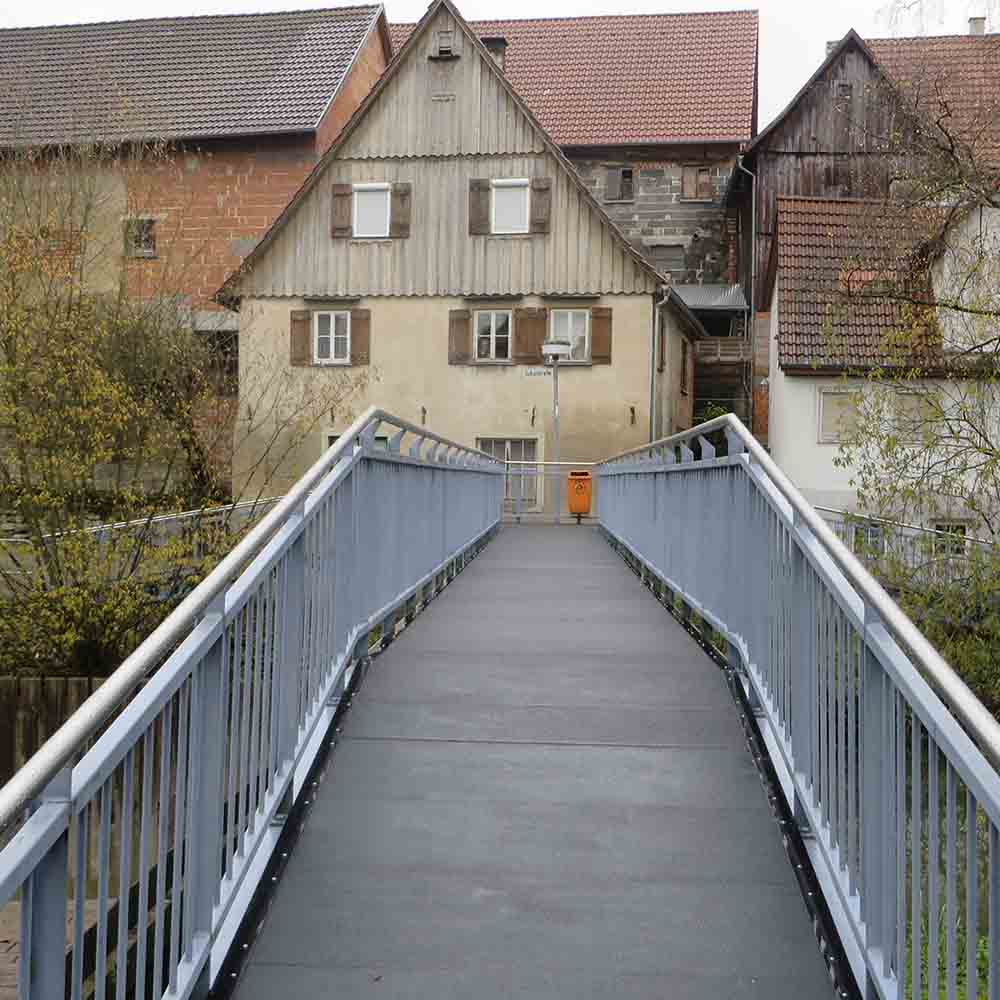 Onze GVK Brugdekplank 500.40 wordt door overheidsorganisaties, gemeenten en aannemers veelgekozen voor zowel nieuwbouwprojecten, als renovatie. Mede vanwege de breedte van 500mm zijn er voor een overspanning minder planken nodig. De keuze voor de 500.40 GVK Brugdekplank voor de brugdek renovatie van de voetgangersbrug in Obersontheim heeft er voor gezorgd dat de verbinding in zeer korte tijd is heropend. Om een veilige oversteek voor voetgangers te garanderen bevat het GVK Brugdek een door de Stadt zelfgekozen antislip- en slijtlaag.