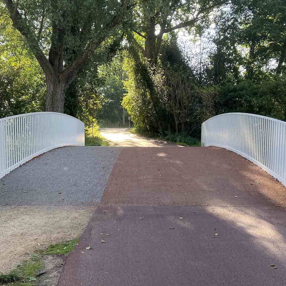 Due to a large-scale renovation of the Schoterbos in the heart of Haarlem, we were asked to supply 772 m² of GRP Bridge Deck Plank 500.55 for the construction of pedestrian and bicycle bridges. The Schoterbos was in need of renovation due to flooding, poor accessibility and an outdated drainage system. The municipality decided to enrich the city park with more space for water, a generous system of paths and multiple cycle paths. The new nature park, covering a total of 24 hectares, is characterised by its water-rich layout and recognisable features such as the utility garden island, event island and play hill. Due to the many water routes, the construction of GRP pedestrian bridges and GRP cycle bridges was inevitable. krafton® supplied contractor Oosterhof Holman with approximately 772 m² of GRP bridge decking for six bridges in the Schoterbos. The GRP bridge decks, which are used by both cyclists and pedestrians, have been given clearly different colours of anti-slip and wear layers for each type of use. This makes it clear on the bridge deck which part of the road is intended for cyclists and which part for pedestrians.